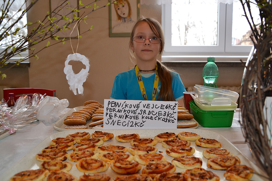 Na prodejních pultech vytvořených ze stolů v jídelně bylo k vidění sladké i slané pečivo, domácí čokoládové tyčinky, dortíky, velikonoční perníky, jednohubky, chlebíčky, ale také nejrůznější velikonoční ozdoby a pomlázky. Ty vyráběl například Teodor Ficek.